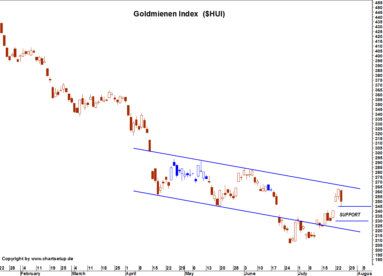 In dieser Zeit hat sich der AMEX Gold Bugs Index (HUI) der Gold- und Silbermienenaktien nahezu gedrittelt. Von über 600