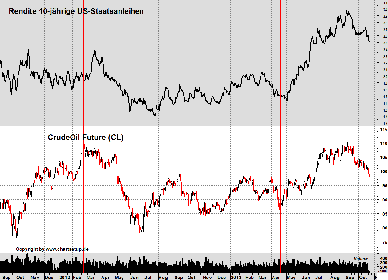 Erkennbar ist beim Vergleich von Ölpreisentwicklung und Rendite 10-jähriger US-Staatsanleihen aber außerdem, dass die markanten