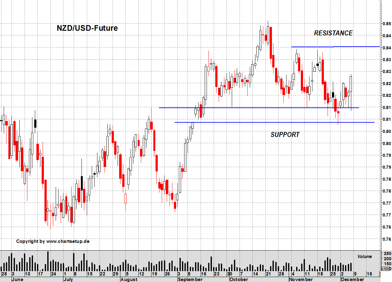seit September hat der Kursverlauf des NZD/USD-Future sein Ausbruchsniveau mehrfach getestet und für scheinbar ausreichend befunden.