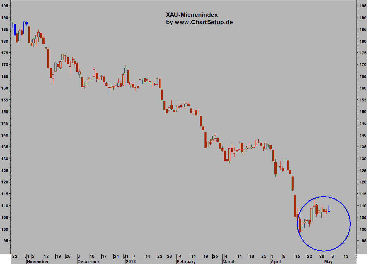 Mienenindizes ($XAU, $HUI) mindestens bis an ihre alten Tiefpunkte von Mitte April 2013 sinken lassen, vermutlich sogar