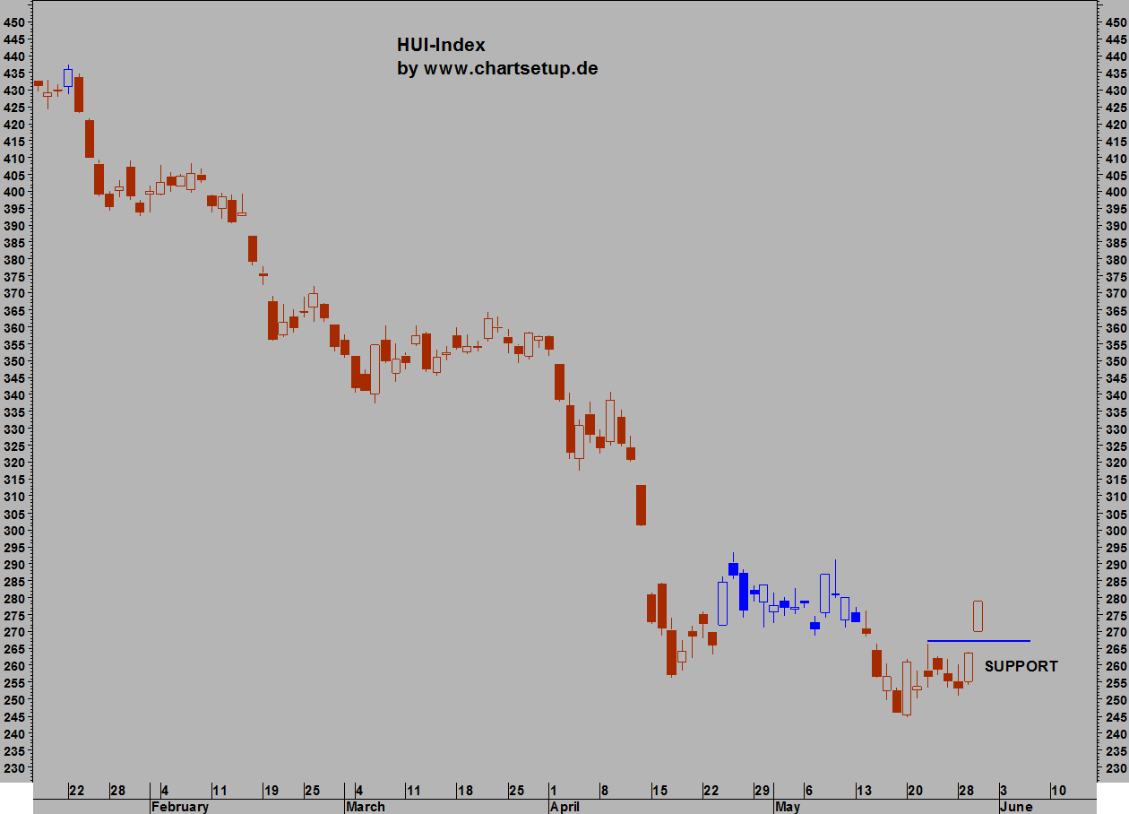 Hochpunkte um 290-295 Punkten kurzfristig ebenfalls überschritten werden, springt die Börsenampel für den HUI-Index von rot auf orange.