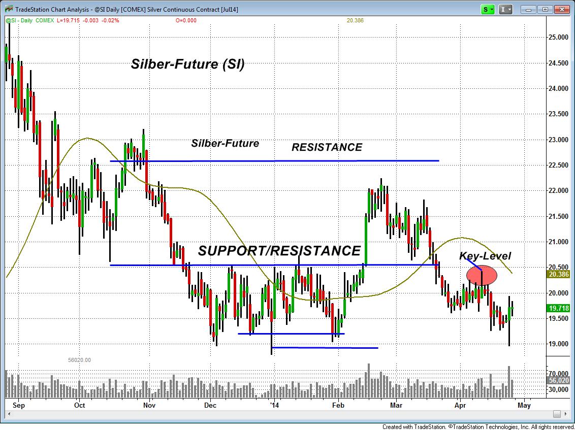 Im Gegensatz zum Gold stößt der Silber-Future allerdings jetzt bei knapp über 20 US-Dollar auf ein