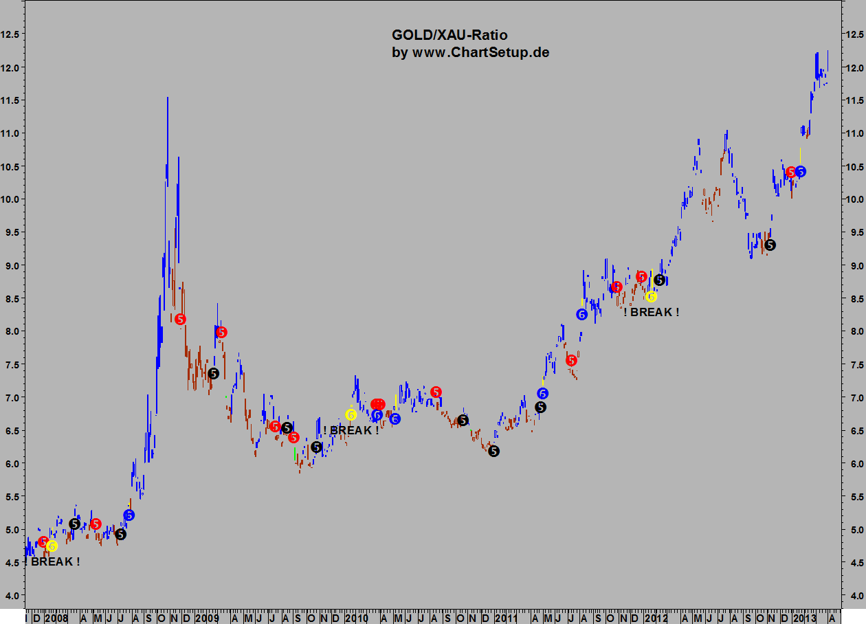 Das Ratio Goldpreis zu Goldmienen (Goldpreis/XAU) hat in jüngster Zeit immer wieder neue Hochpunkte erreicht, zuletzt mit 12,20